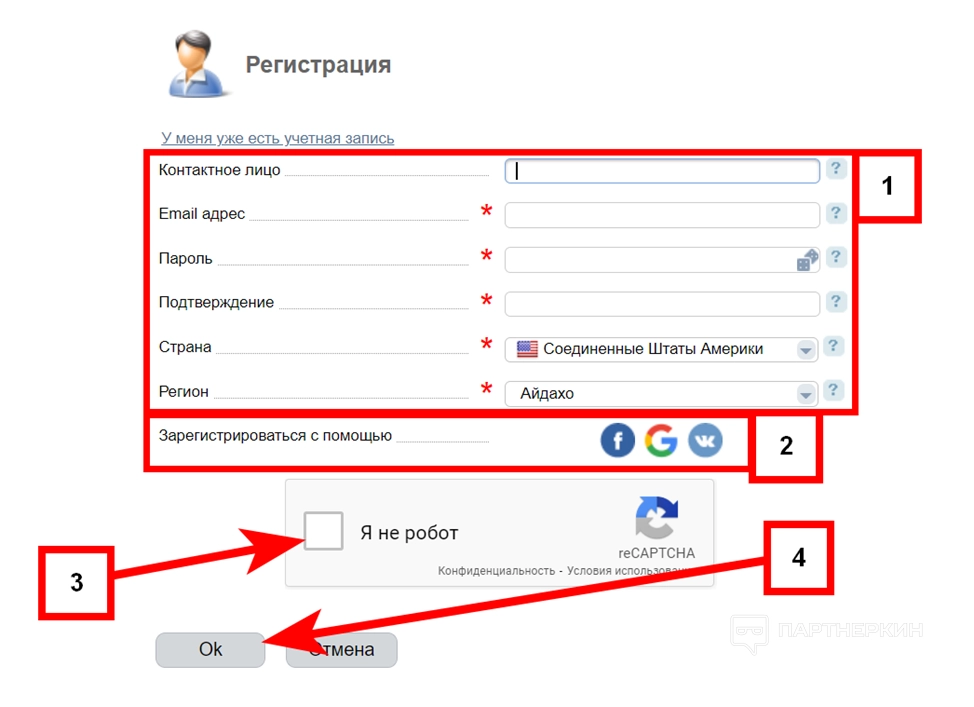 3. Для создания профиля заполните форму (1), или зарегистрируйтесь с помощью любого сервиса (2). Если выбираете сервис, тогда следующие пункты пропустите.