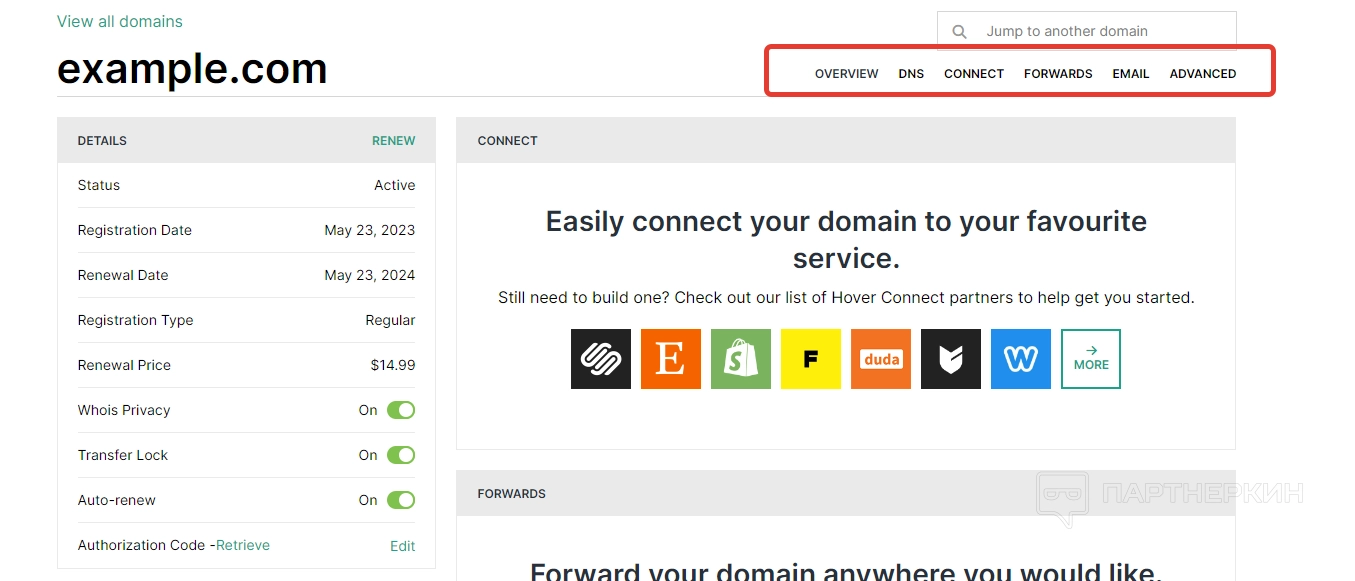 - Overview. Вкладка с подробными данными о домене (дата приобретения, цена, серверы имен, владелец, конфиденциальность WHOIS и т.д.).