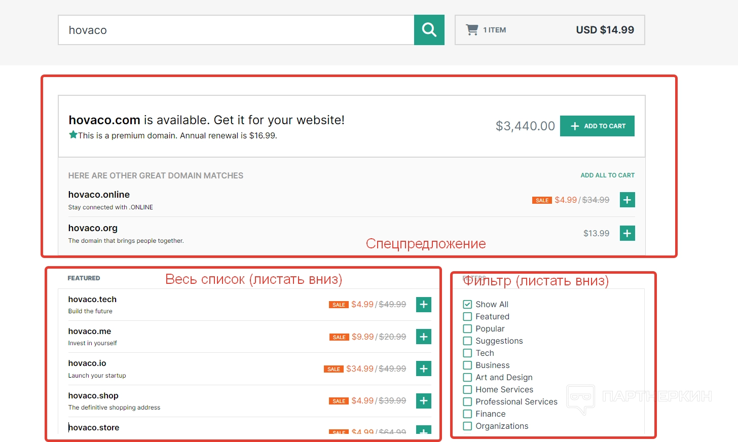 Когда пользователь задаст название, откроется страница, состоящая из нескольких блоков. В первом блоке будет спецпредложение, стоимость и самые популярные домены. Во втором блоке пользователь найдет весь перечень доступных предложений, каждый из которых подходит для определенной категории бизнеса в Интернете. Также стоит обратить внимание на фильтр, разделяющий домены по статусам, спецпредложениям и категориям.
