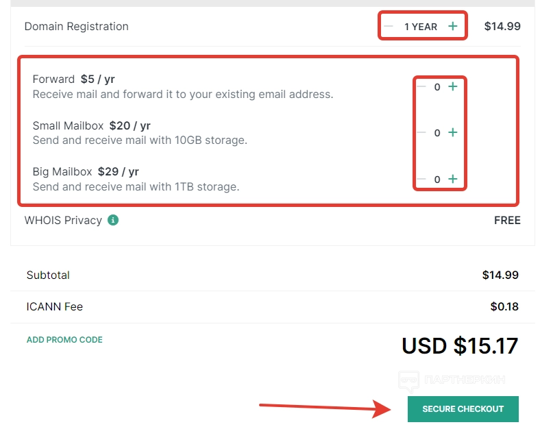 В корзине вебмастер может сразу оформить корпоративный почтовый ящик с собственным доменным именем. Стоимость почтового ящика зависит от его объема и функциональных возможностей. С помощью значков «плюс/минус» можно регулировать количество email и продолжительность действия доменного имени. Когда все параметры будут настроены, жмем на «Secure checkout» и выбираем подходящий способ оплаты.