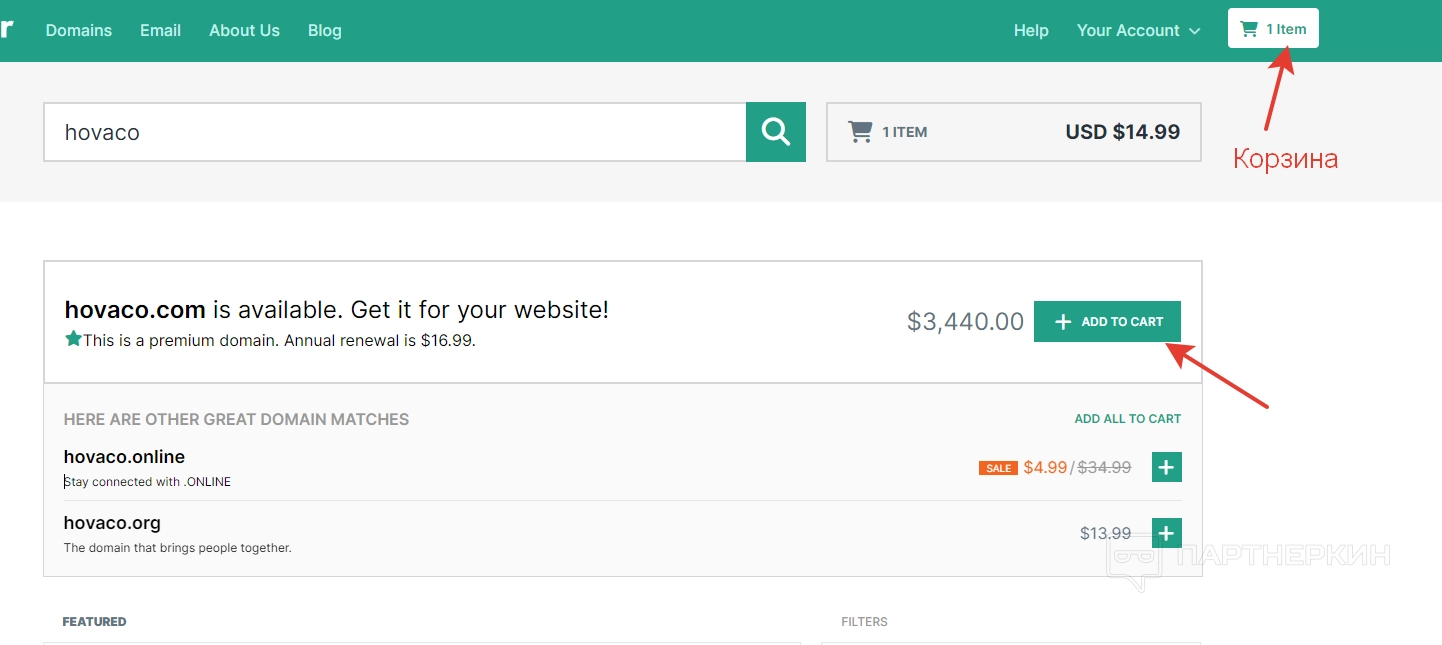 Чтобы приобрести домен, выбираем подходящий вариант, жмем на кнопку «Add to cart» и переходим в корзину.