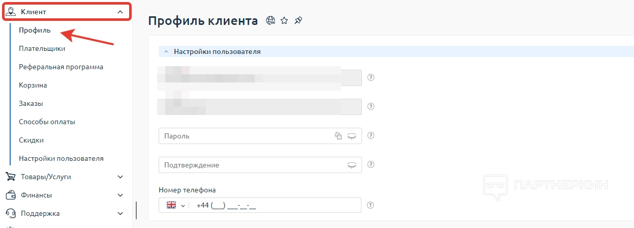 Раздел «Клиент» состоит из разных блоков. Например, в блоке «Профиль» пользователь может сменить пароль и номер телефона.