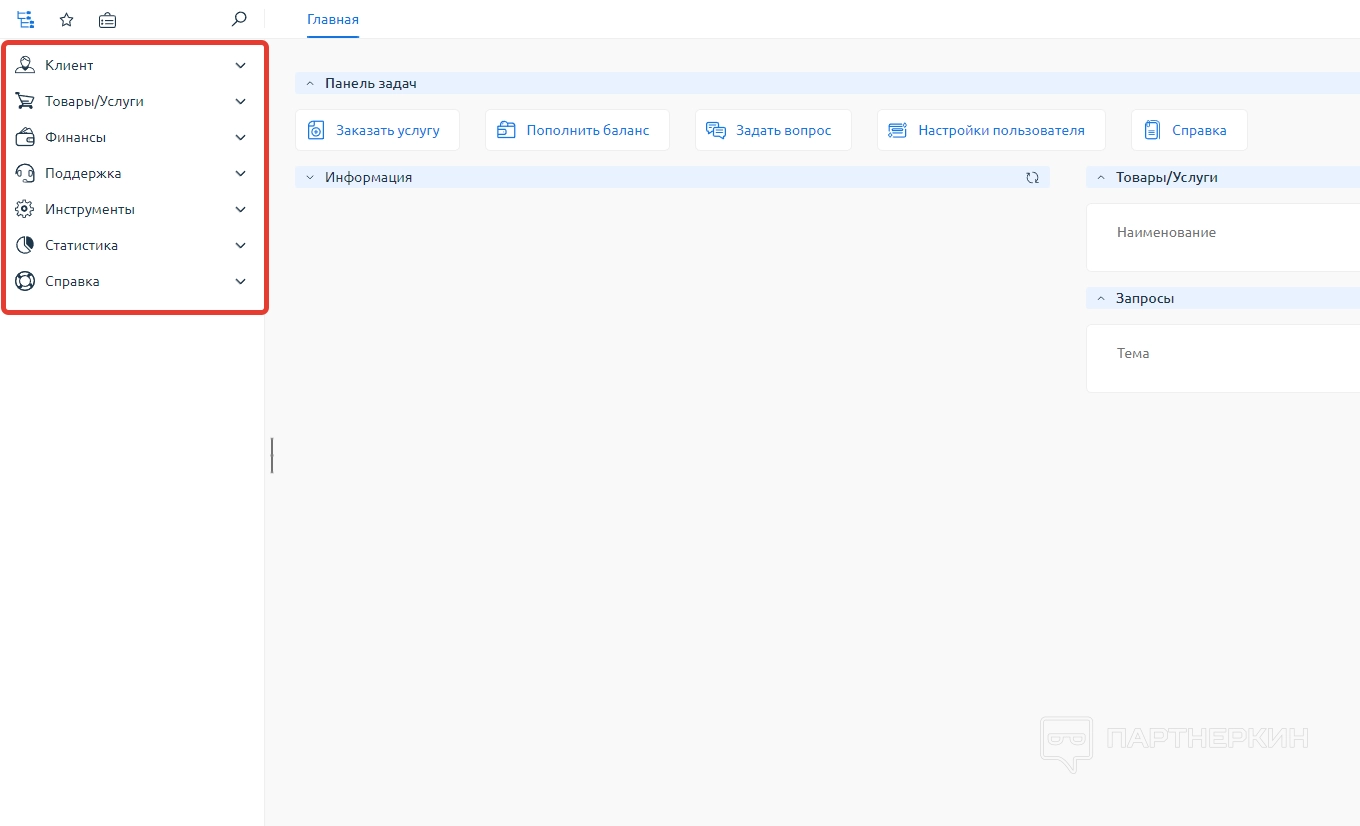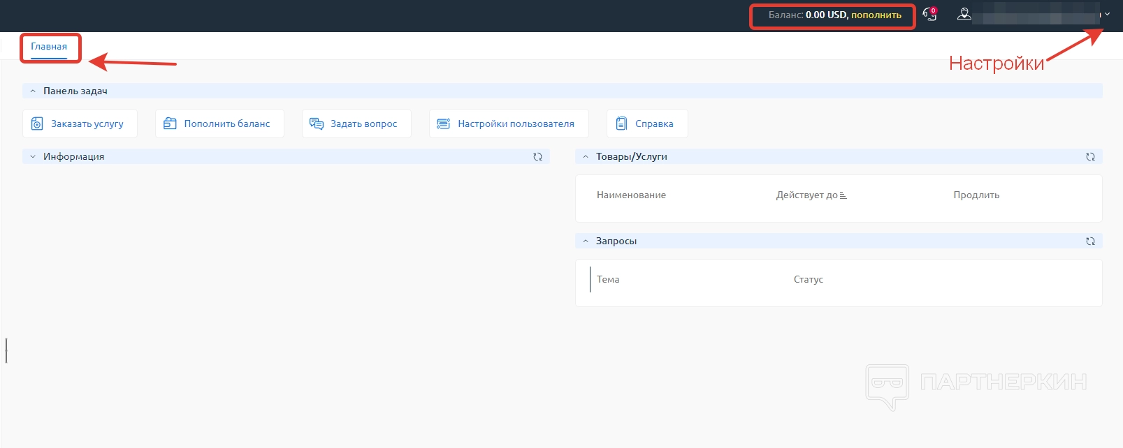 После регистрации пользователь попадает на главную страницу личного кабинета, где будет панель задач с разными кнопками, а также сводная информация по запросам и товарам/услугам. В верхнем правом углу экрана вебмастер найдет текущий баланс, кнопку для его пополнения и доступ к настройкам аккаунта.