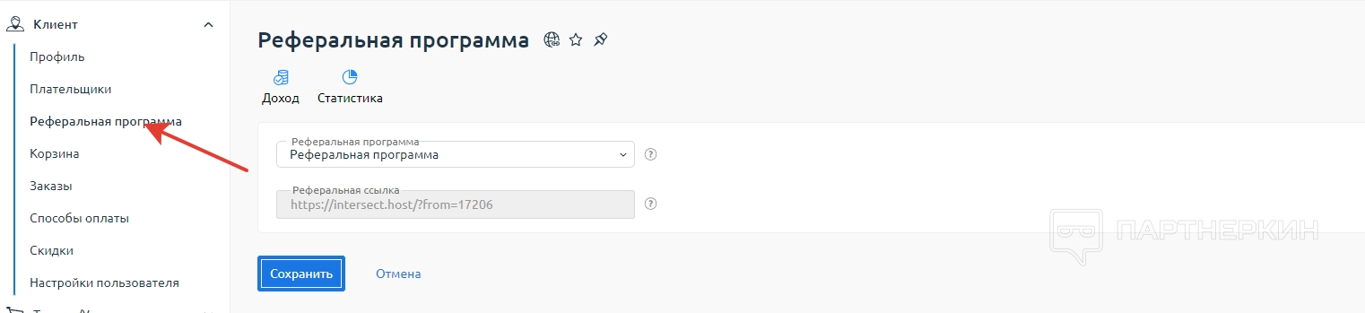 Во вкладке «Реферальная программа» пользователь найдет партнерскую ссылку, а также информацию по доходам и статистику по привлеченным пользователям.