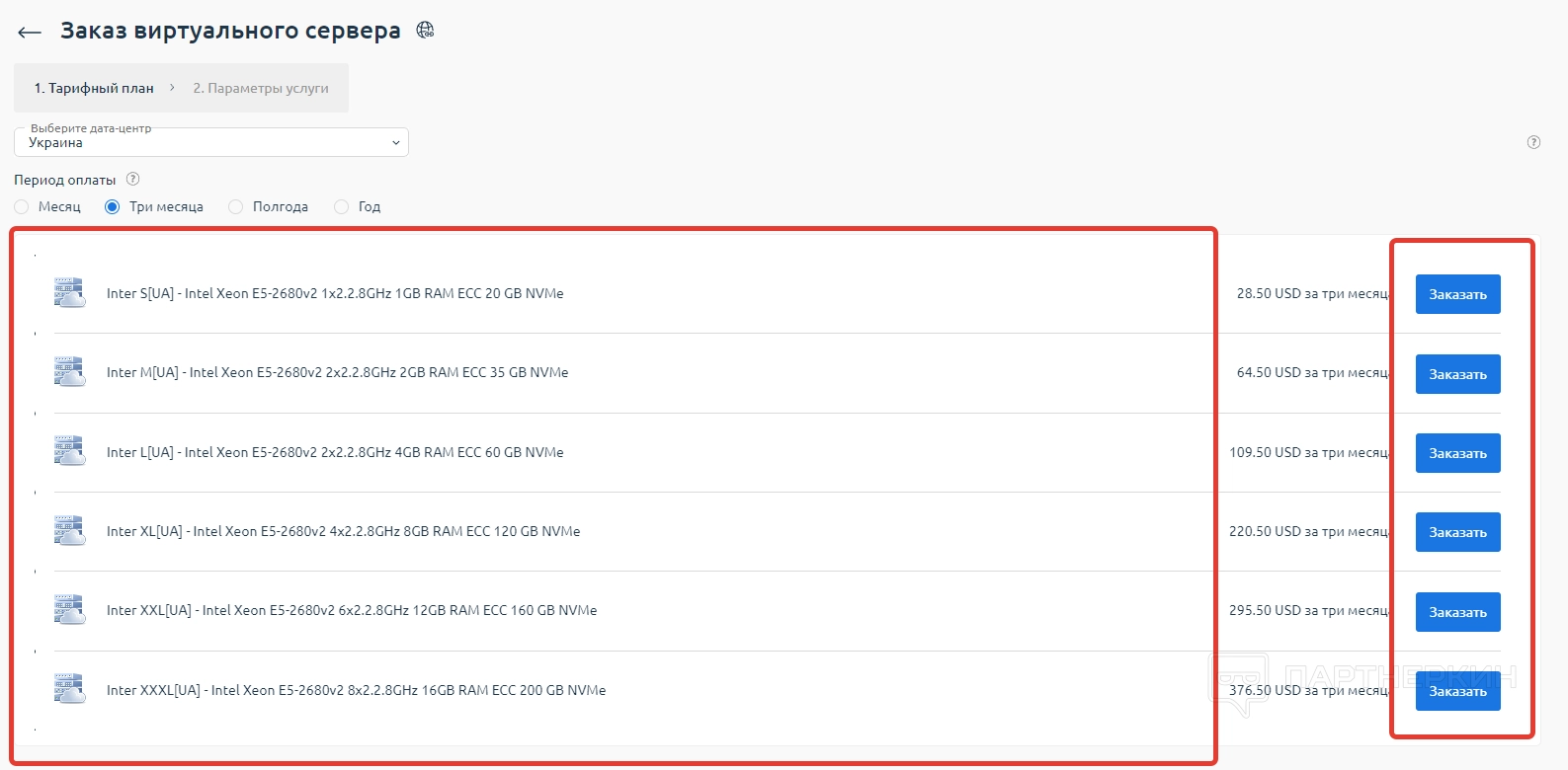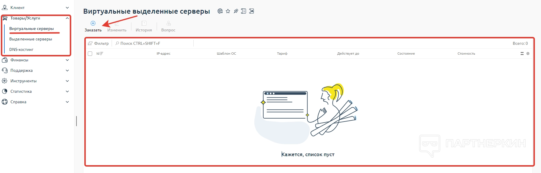 - Товары и услуги. В этом разделе вебмастер может оформить приобретение серверов.