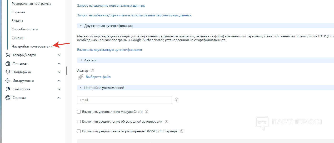 Особое внимание стоит уделить вкладке «Настройки пользователя», где владелец аккаунта может настраивать уведомления, добавлять аватарки, менять визуальное отображение кабинета и пользоваться двухфакторной аутентификацией.