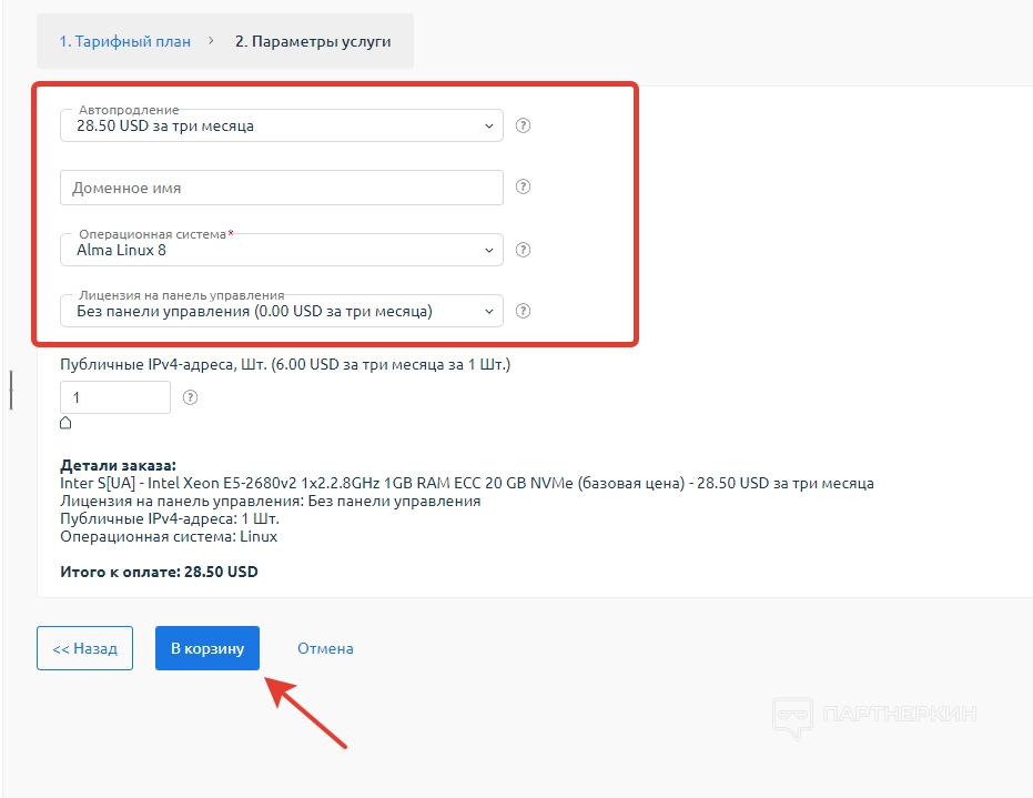 Откроется еще одна форма, где нужно указать доменное имя, панель управления, количество публичных IPv4-адресов и операционную систему. Какие ОС поддерживались на момент написания статьи: