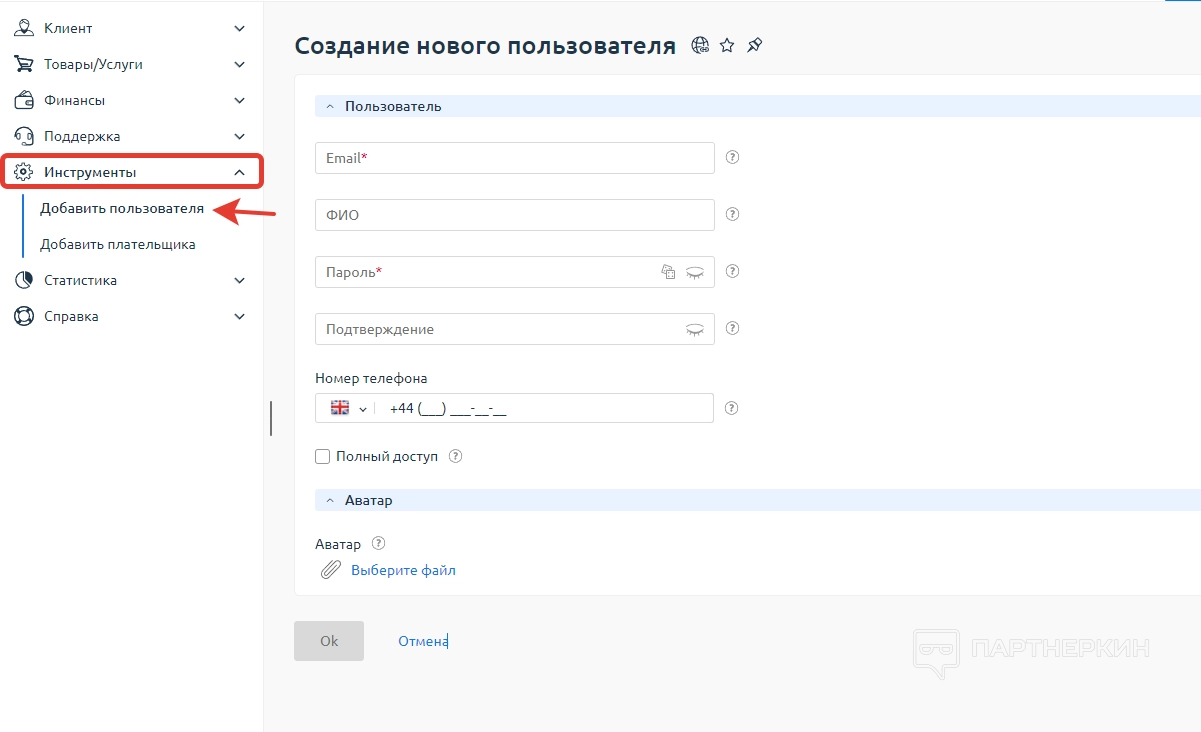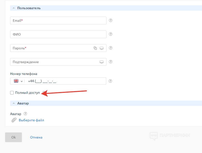 Далее откроется форма, в которой нужно указать электронную почту, ФИО, пароль и номер телефона добавляемого пользователям. Если поставить галочку напротив «Полный доступ», у добавленного пользователя не будет никаких ограничений в функционале.