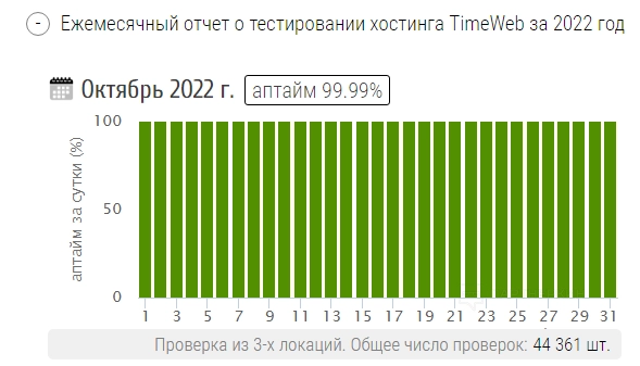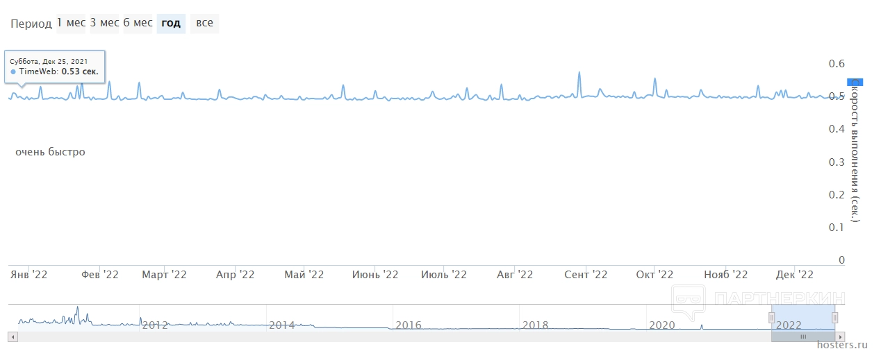 Что касается аптайма, согласно этому же источнику, по результатам проверок хостер показывает параметр 99.9%. По данным hosters, сервер был недоступен только один раз в октябре 2022 года в течение 3-х минут. В среднем ответ сервера составляет 250 мс при запросе из Москвы и 55 мс из Санкт-Петербурга.