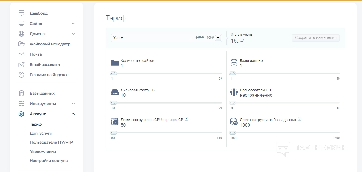 Ценообразование зависит от количества сайтов на хостинге, нагрузки на БД и дискового пространства. Цены стартуют от 169 ₽/мес, допустимое количество сайтов на самом мощном тарифе – 100.