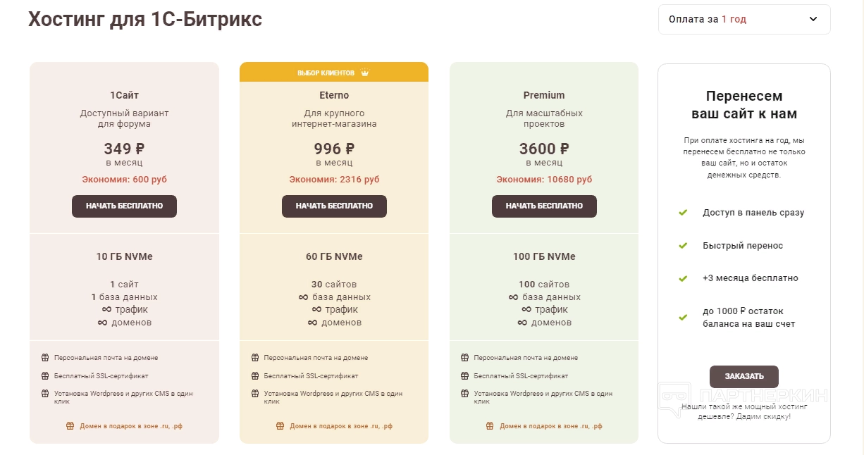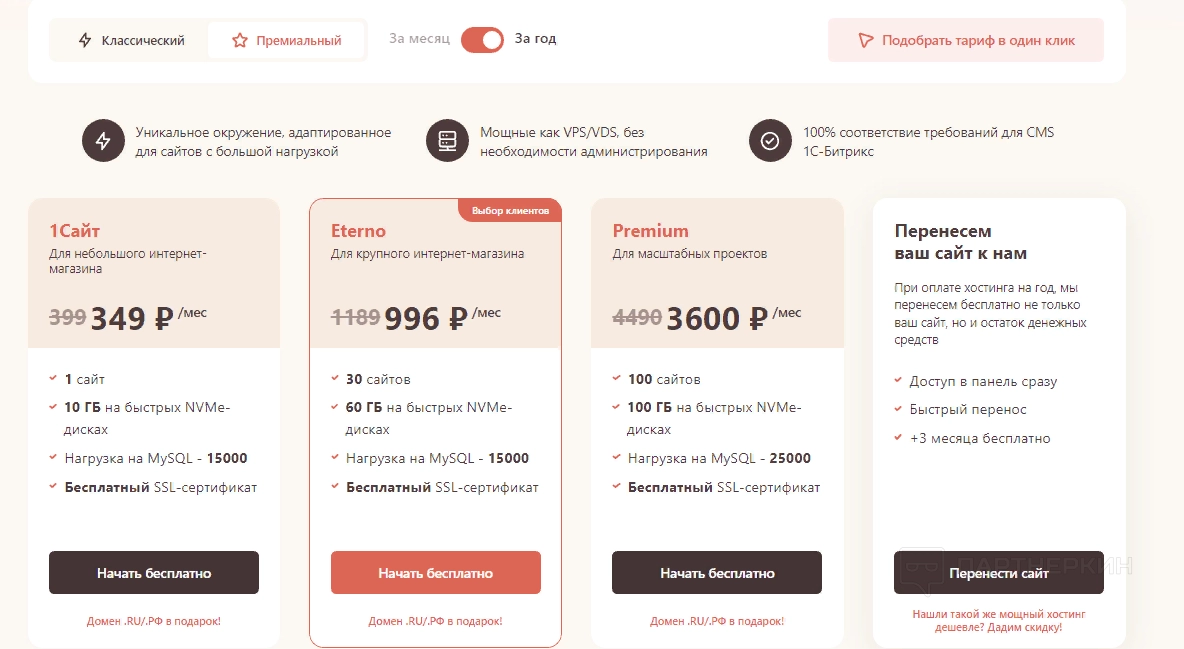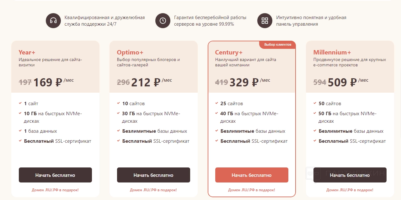 - При оплате тарифа за год предоставляется домен в зоне .ru, .рф, .host, .website, .space, .site, .online, .fun.