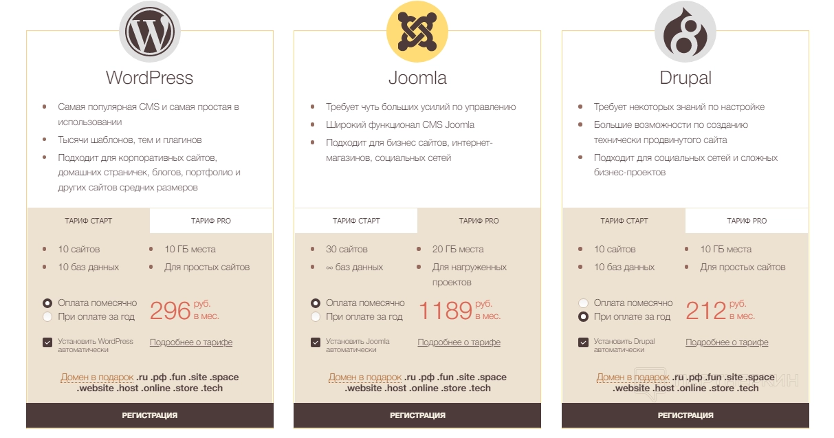 Этот вариант подходит для тех, кто работает с сайтами на базе популярных движков. В этом случае пользователь приобретает хостинг с предустановленной CMS и оптимальными настройками, подобранными под выбранную систему управления. Доступные варианты – Wordpress, Joomla и Drupal.