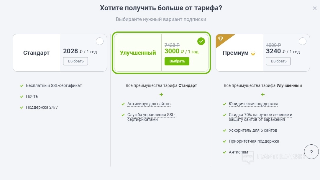 На всех тарифах доступны бесплатный SSL-сертификат, почта с пользовательским доменом и техническая поддержка 24/7. Тариф «Улучшенный» также включает в себя антивирус для сайтов и службу управления сертификатами. «Премиум» дополнительно дает доступ к юридической помощи, систему ускорения для 5-ти сайтов, антиспам и скидка 70% на лечение зараженного ресурса.