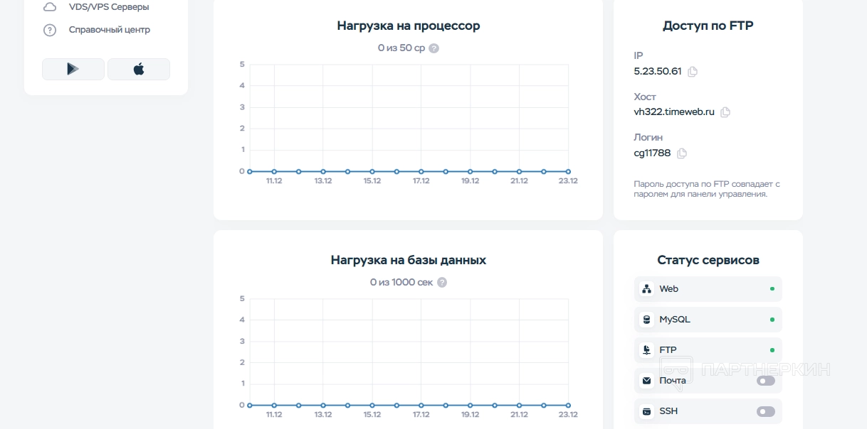 - Инструменты – доступ к журналу логов, детальное отслеживание нагрузки, SSH-консоль, планировщик Crontab.