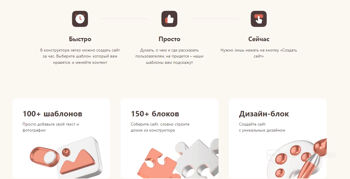 Конструктор сайтов позволяет создать современный дизайн без знания кода и верстки. Пользователи могут создавать страницы, составляя их из блоков с контентом. На сайте есть более 100 готовых шаблонов, 150 блоков с наполнением и возможность создавать собственные дизайн-блоки.