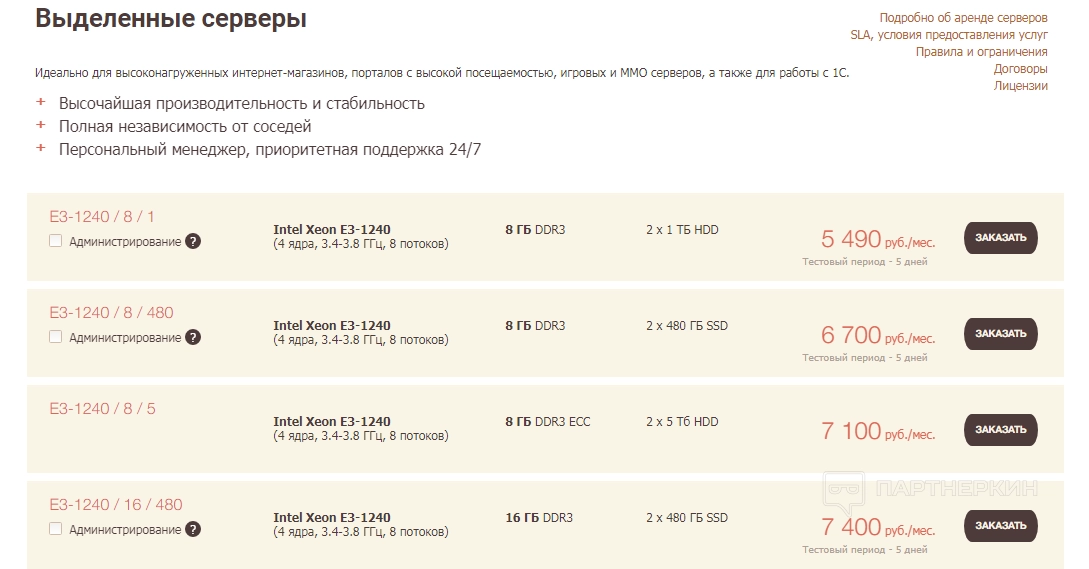 Кроме того, на сайте можно заказать аренду выделенного сервера. При заказе этой услуги клиенту выделяется персональный менеджер с возможностью круглосуточной поддержки. Помимо готовых конфигураций, можно отправить заявку на сборку варианта под особые задачи.