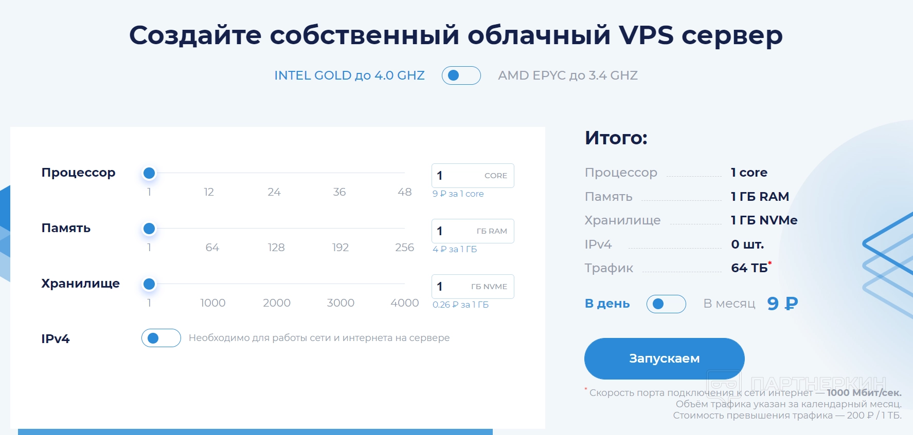 Самое дешевое предложение: 9 рублей/день, 270 рублей/месяц. Пользователь получает возможность открыть сервер с процессором на одно ядро, 1 Гб оперативки, а также 1 Гб хранилища с трафиком до 64 Гб. Идеальный вариант для начала работы.