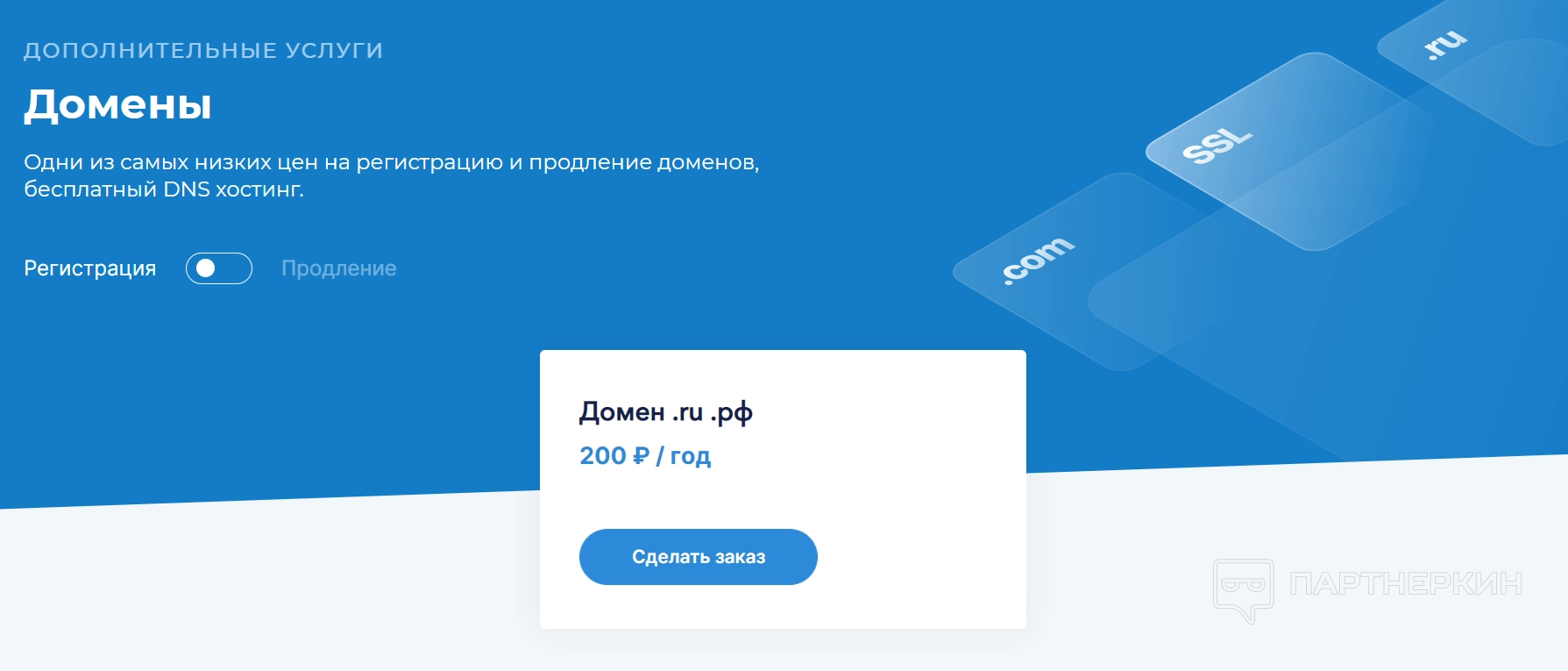 Одна из приятных особенностей платформы — внутри панели управления можно автоматически зарегистрировать домен на «белую» зону (ru; рф; com; net) с формированием DNS. По умолчанию создается протокол от