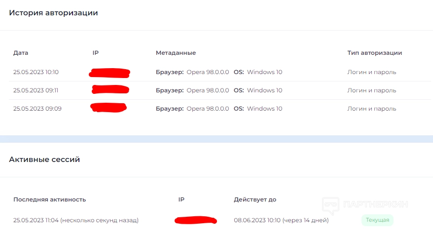 Здесь пользователь может посмотреть историю авторизации и активные сессии. Параметры для анализа: дата, IP-адрес, метаданные, тип авторизации, последняя активность.