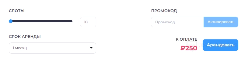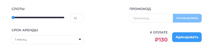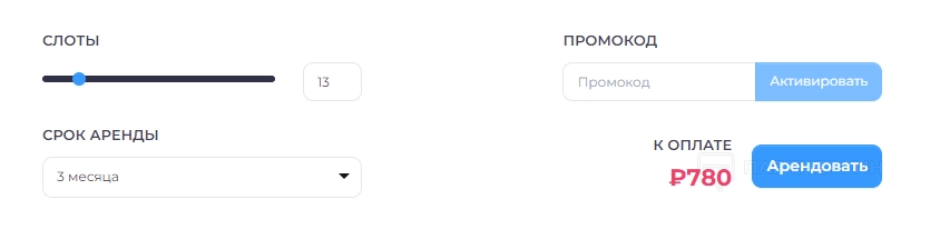 Выбрав тариф, пользователю следует указать количество слотов (от 10 до 32), срок аренды (от 1 до 3 месяцев), ввести промокод (при наличии) и нажать кнопку «Арендовать».
