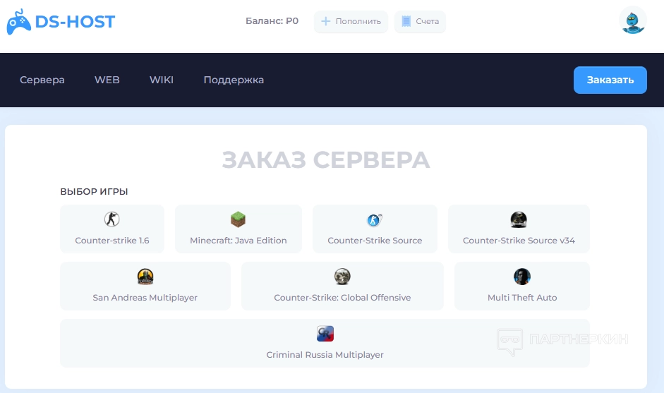 - Ограниченный выбор игр. На сайте DS-HOST представлены Minecraft, CS 1.6, CS:GO, CSS, SA:MP и некоторые другие популярные игры. Если пользователь захочет арендовать сервер по Valorant или Call of Duty, у него не получится это сделать.
