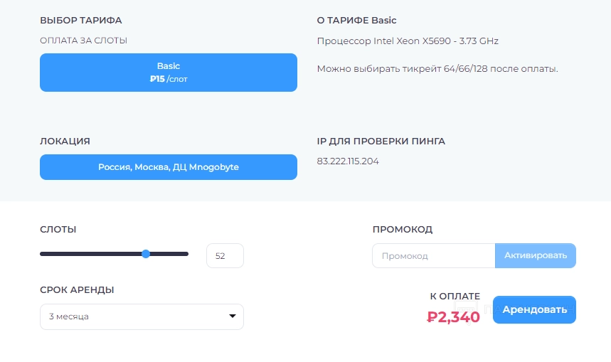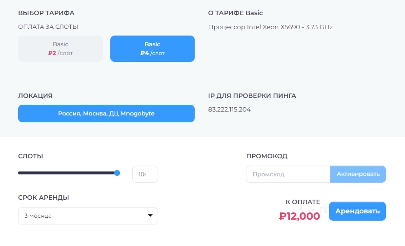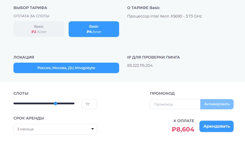 Далее нужно выбрать количество слотов (от 20 до 64), указать срок аренды (от 1 до 3 месяцев), ввести промокод (при наличии) и перейти к оплате.