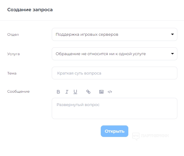 - Отдел. В выпадающем списке необходимо выбрать один из трех вариантов — основные вопросы, поддержка игровых серверов, финансовые вопросы.