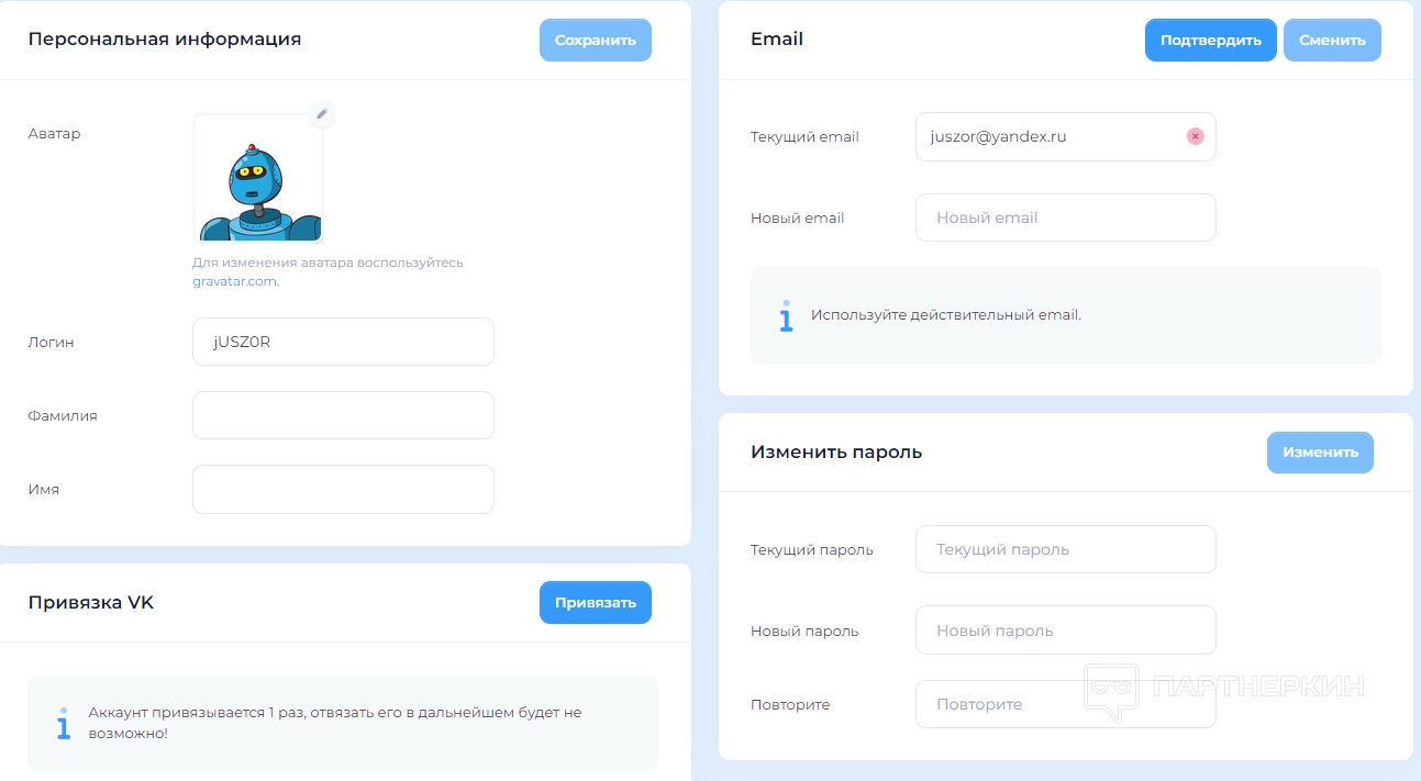 Еще здесь можно изменить пароль и привязать профиль «ВКонтакте» (аккаунт привязывается один раз, отвязать его в дальнейшем будет невозможно).