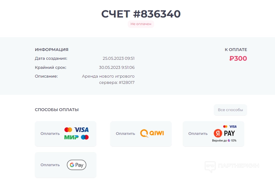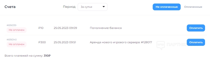 В разделе «Счета» представлена информация по оплаченным и неоплаченным игровым серверам. Для удобства можно выбрать период за: