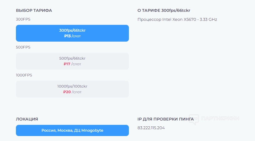 - 300 fps (₽ 10 за слот). Процессор Intel Xeon X5670 (3.33 GHz). Самый дешевый и простой тариф. Не подходит для игровых серверов, требующих повышенных ресурсов.