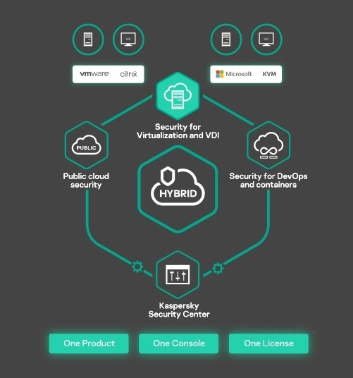 Доступна интеграция с публичными облаками через Native API, агенты виртуализации, виртуальные рабочие столы VDI, интеллектуальные технологии с общим кэшем.