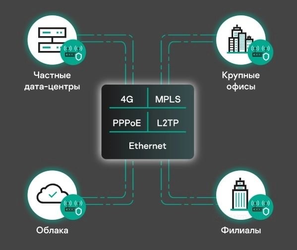 Комплексное решение позволяет обеспечивать безопасность сети и офисов. С помощью SD-WAN компании-клиенты могут создать единую отказоустойчивую филиальную сеть. Сервис подходит компаниям с разветвленной филиальной сетью.