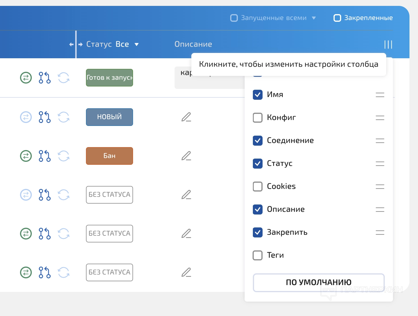 Есть возможность настройки столбцов. Например, если активно не используете «Описание», ограничиваясь «тегами», то можно добавить столбец «статус», который будет описывать текущий статус аккаунта в сессии, внося изменения к сессии без текстовой работы, просто меняя в пару кликов на готовые статусы, которые добавили в систему.