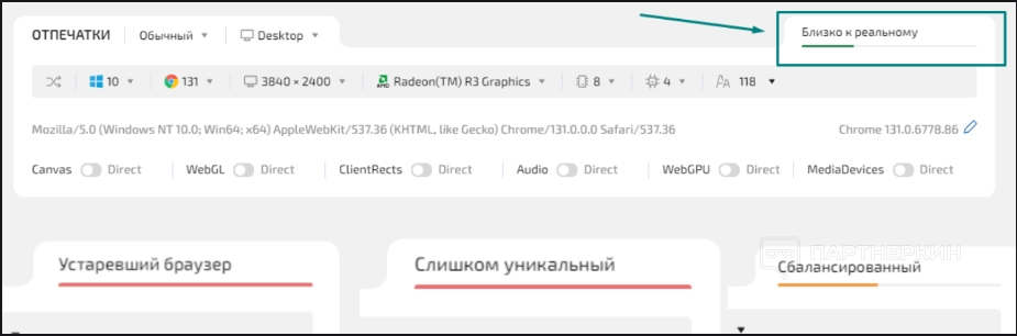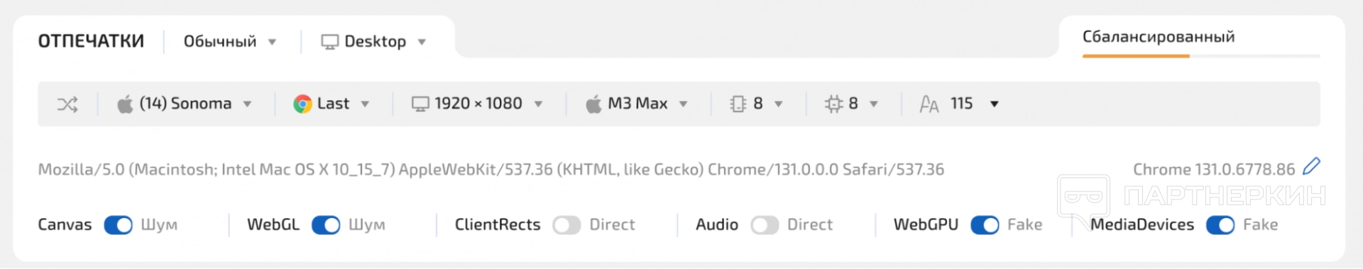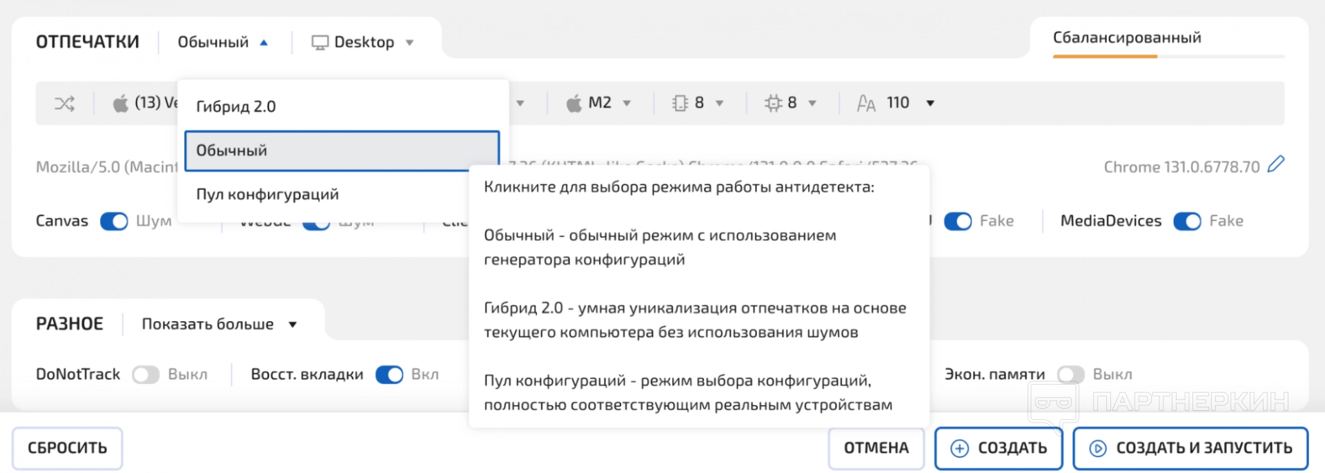 При генерации сессии доступен обычный режим, где конфигурации генерируются автоматически, гибридный — на основе отпечатков текущего компьютера без использовании шумов, а также пул готовых конфигураций реальных устройств.