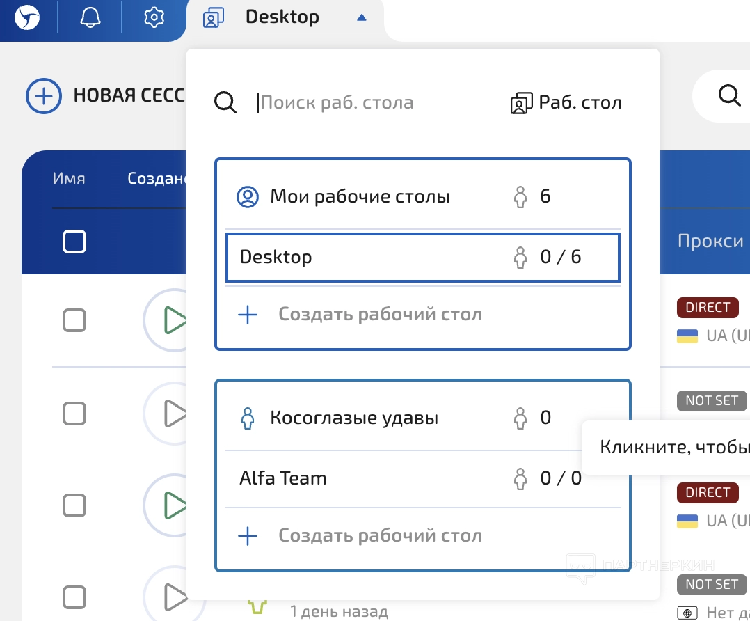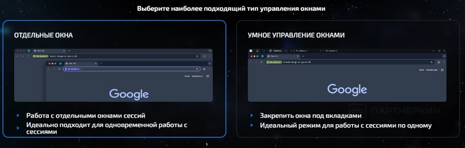 . Каждая сессия представляет собой закрепленную вкладку в едином интерфейсе браузера.