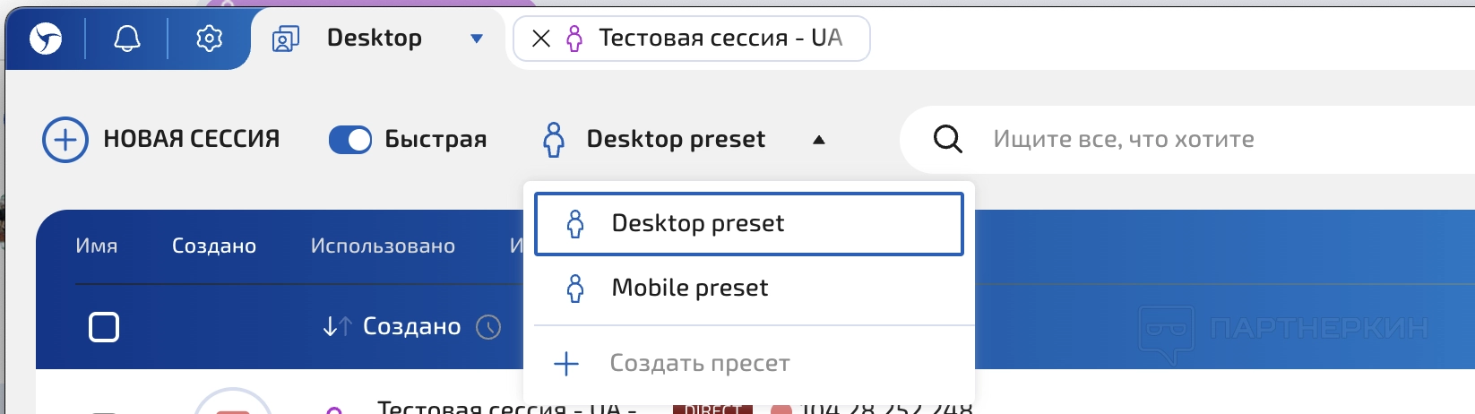 Для быстрого создания сессий браузера есть возможность выбора шаблонов настройки сессии — предварительных настроек, которые будет использовать браузер при создании сессии.