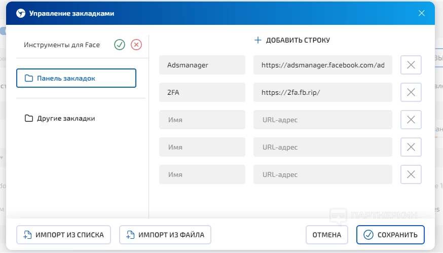При желании можно добавить необходимую стартовую страницу сессии, закладки, расширения, управление паролями. Этот функционал лучше внести в шаблон создания сессий, чем каждый раз добавлять идентичные сайты и расширения. К слову, браузер предлагает систему папок для закладок — можно сгруппировать необходимые инструменты по задачам, источнику трафика или другой логике и добавлять их к нужным сессиям в один клик.