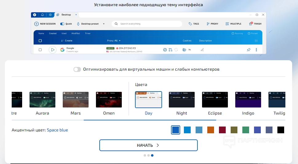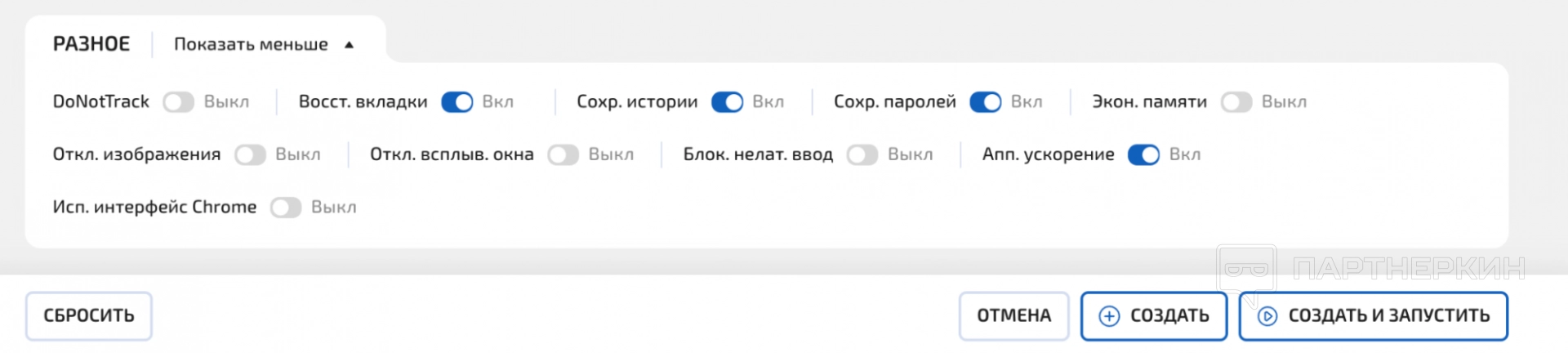 Опционально при создании сессии есть варианты оптимизации потребления ресурсов: браузер может отправлять неактивные вкладки в режим сна, чтобы экономить оперативную память, также отключать загрузку изображений для экономии интернет-трафика ваших прокси.