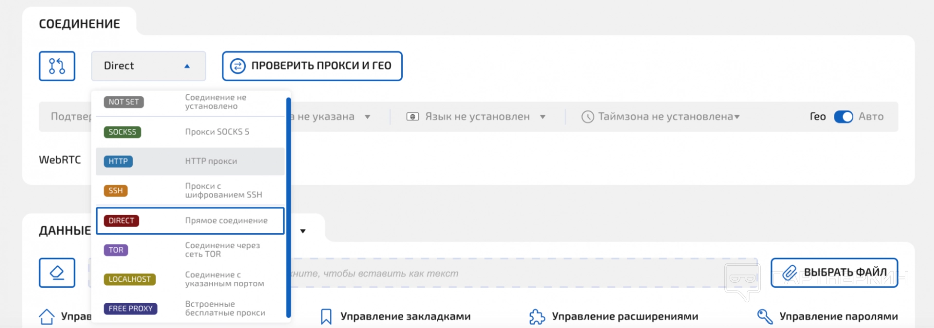 - Выбираем тип соединения сессии. Браузер поддерживает работу через прямое соединение - ваш интернет адрес без подмены (direct), прокси http, socks5, SSH, через встроенные бесплатные прокси, TOR-соединение, а также соединение с указанным портом (localhost).