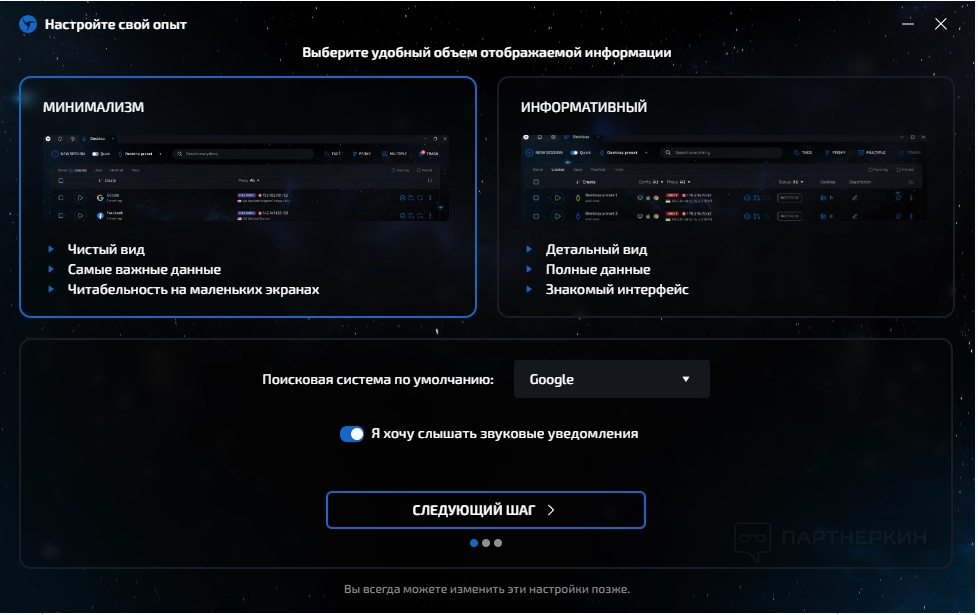 После установки браузера сервис предлагает 2 вариации интерфейса: минималистический и информативный. Названия полностью объясняют ключевые отличия.
