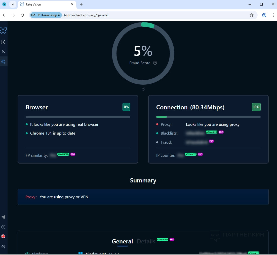 Проверку отпечатков браузер проходит безупречно, впн определился (на нем и тестировалось), но на общем качестве проверки практически не отражается. Можно поменять на качественные мобильные прокси, но для запусков в Facebook и данное решение рабочее.