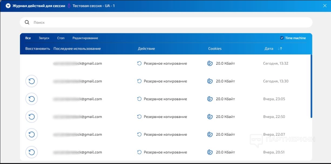 Если выбрать фильтр «Time machine», то браузер сделает выдачу резервных копий этой сессии, которую можно будет восстановить по клику:
