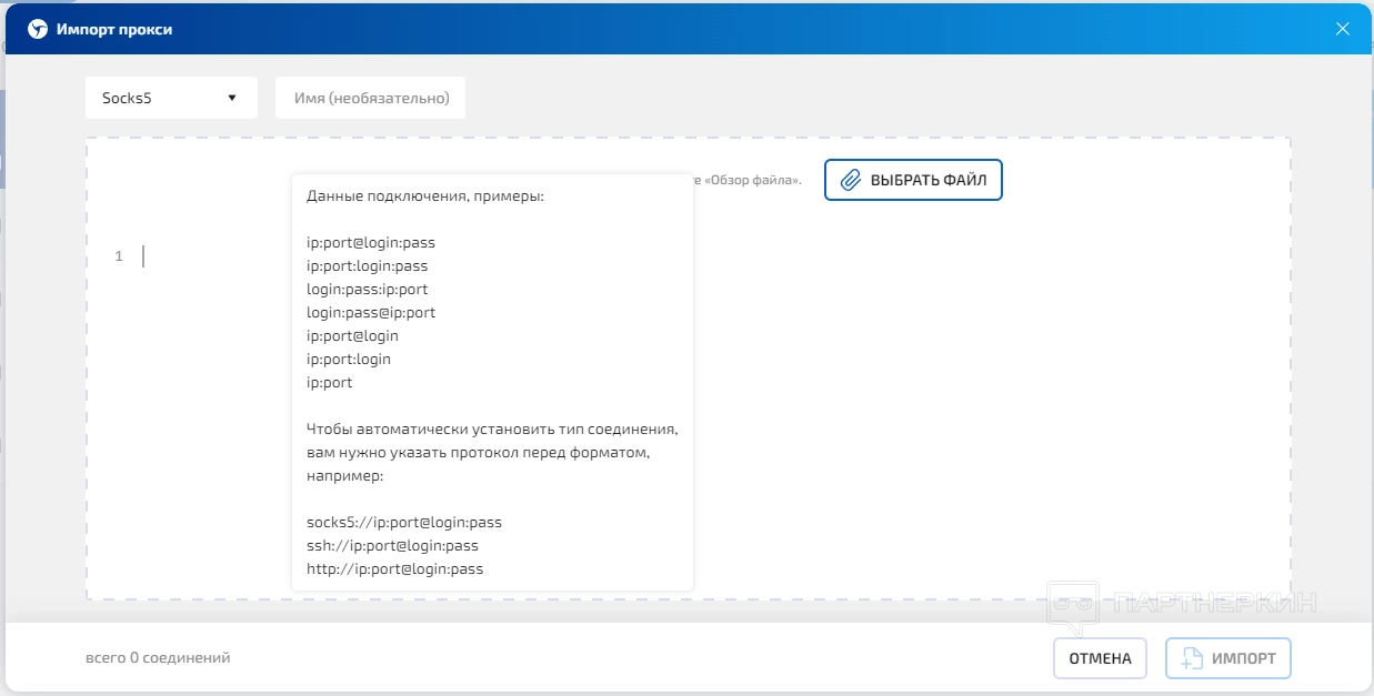 Также есть массовый импорт прокси из списка. Достаточно выбрать тип подключения и загрузить данные в одном из форматов. Браузер самостоятельно распознает из списка и добавит каждый прокси.