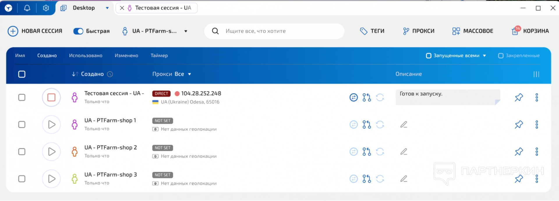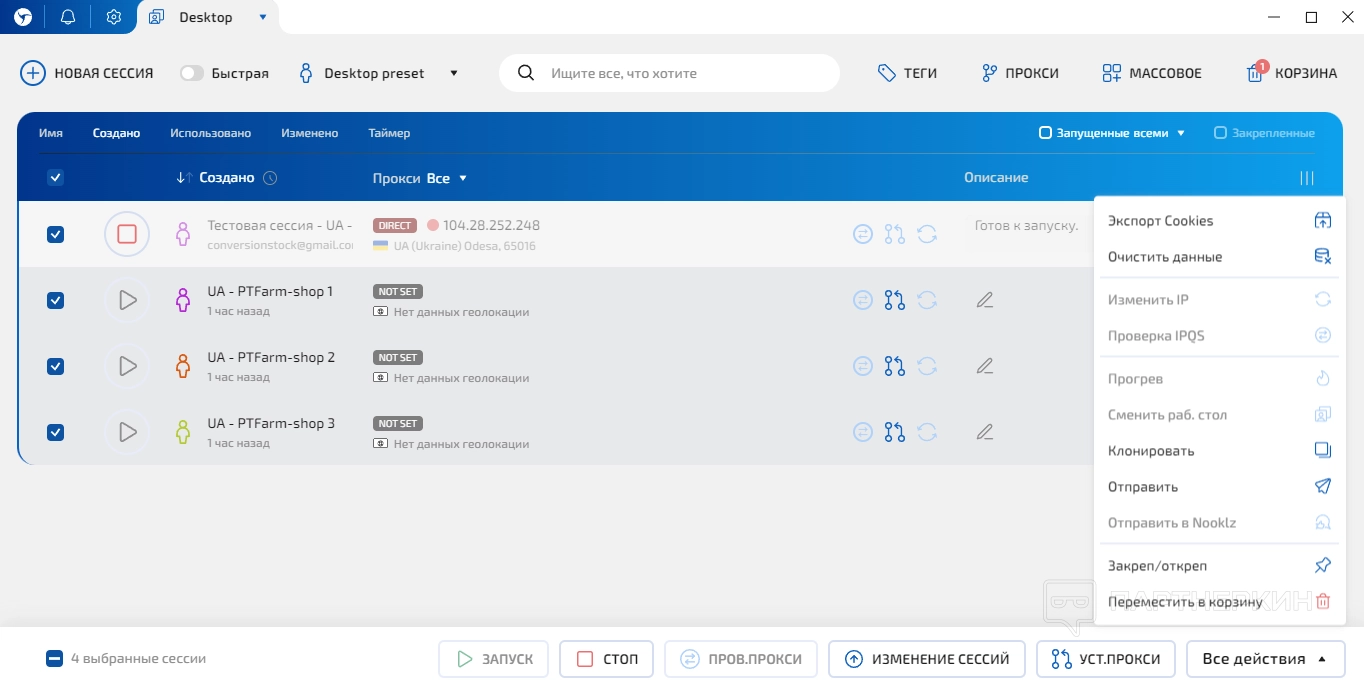 Управлять сессиями можно как массово, выбирая несколько сессии и применяя нужные команды, так и отдельно каждую. Доступны базовые функции типа экспорта куки, очистки всех данных сессии, проверка и смена IP, клонирование сессии, отправка сессии на другую почту (передача доступа к сессии без доступа к вашей учетной записи), удаление, а также закрепление/открепление сессии в топе (фиксируем рабочий профиль на первое место среди других сессий).
