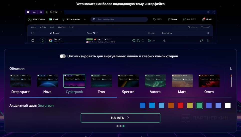 И финальная опция кастомизации — выбор фона и акцентного цвета. Доступно более 15 различных обложек и 10 вариаций цвета. Без ограничения стандартной и ночной темой, можно выбрать свой уникальный дизайн: от красочного фона в стилистике киберпанка или космоса, до сдержанного, классического интерфейса.