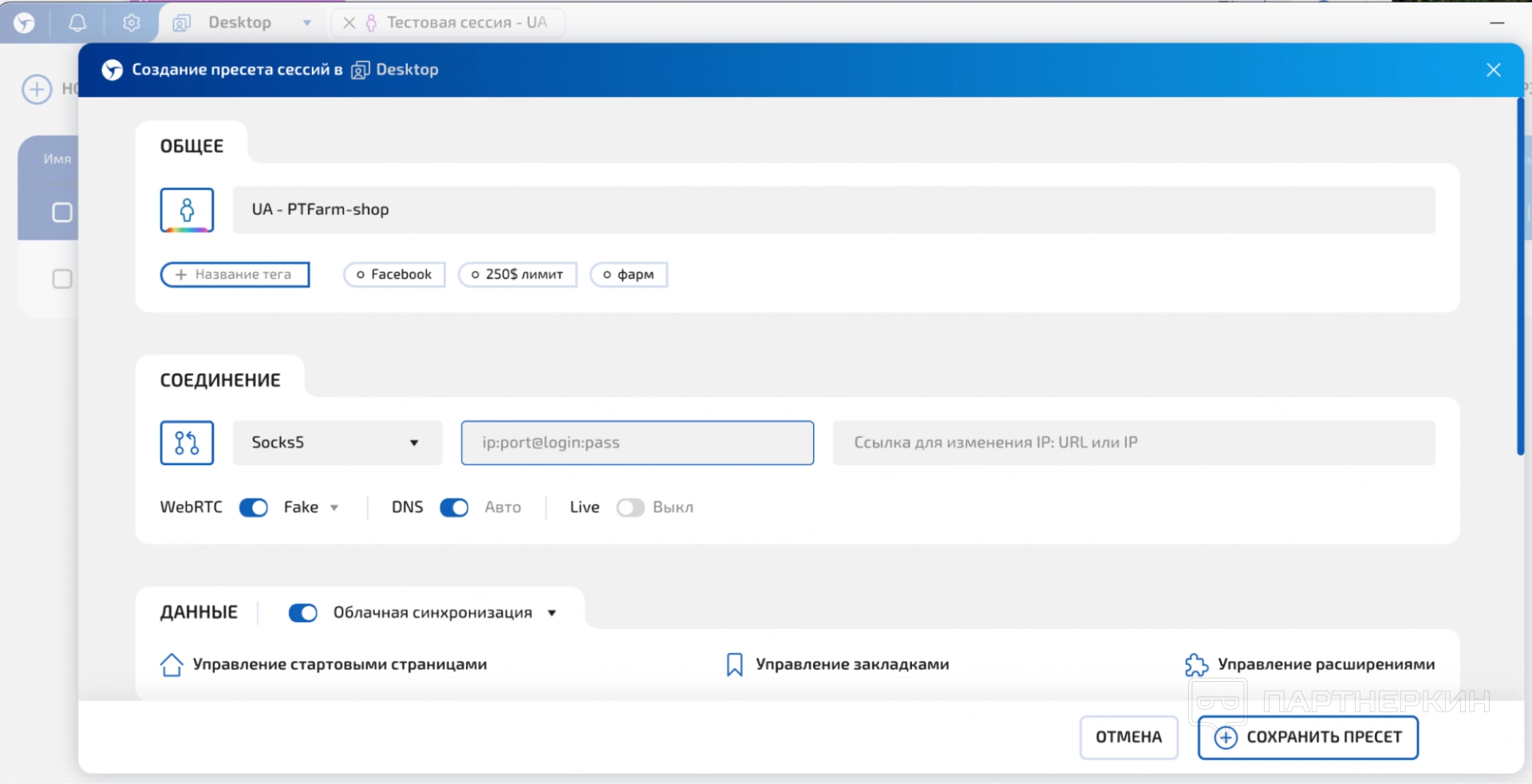 Изначально задаем настройки шаблона (наименования сессий и использование тегов, тип соединения, тип устройства, настройки браузера, стартовые страницы, закладки, расширения) и генерируем сессии с данными настройками в один клик.