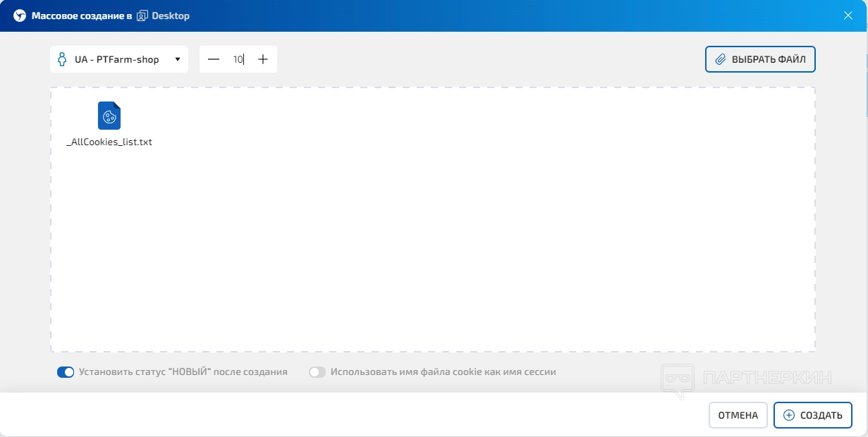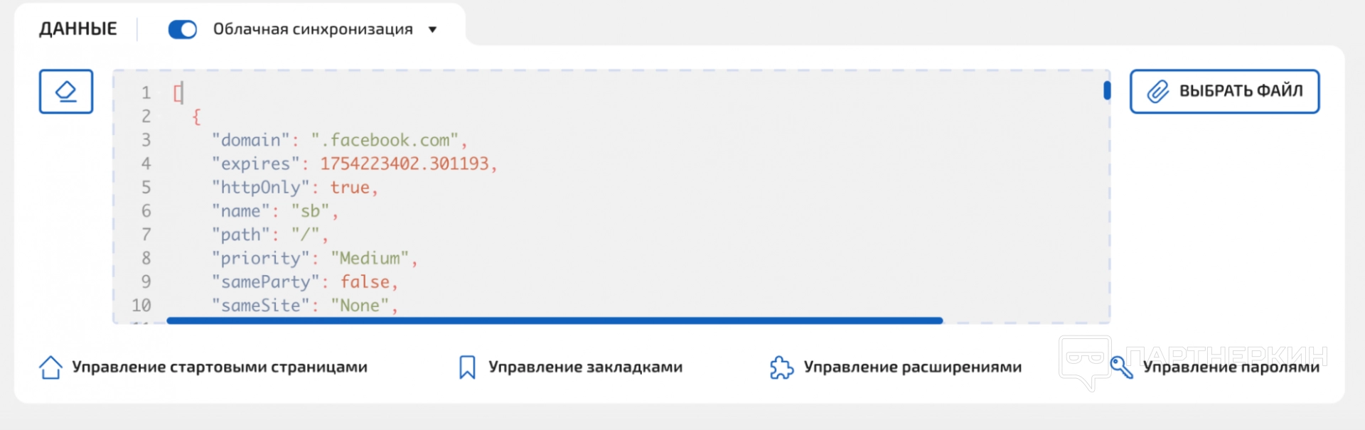 Импортируем Cookies. Можно это сделать вручную — просто вставляем данные копируя, либо загрузить файл с куки.