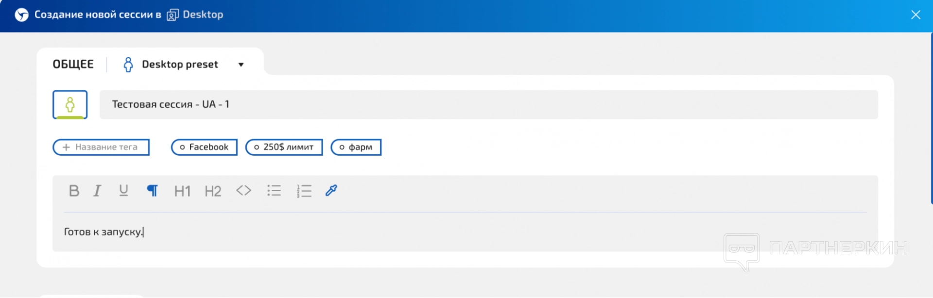 - Задаем название сессии — для удобного дальнейшего менеджмента.