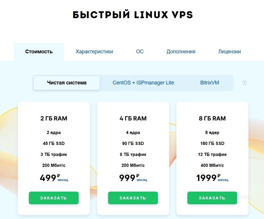 - Базовый тариф — 499 руб./мес . Включает 2 ГБ RAM, 2 ядра процессора, 45 ГБ SSD диска, 3 ТБ трафика, скорость до 200 Мбит/с.
