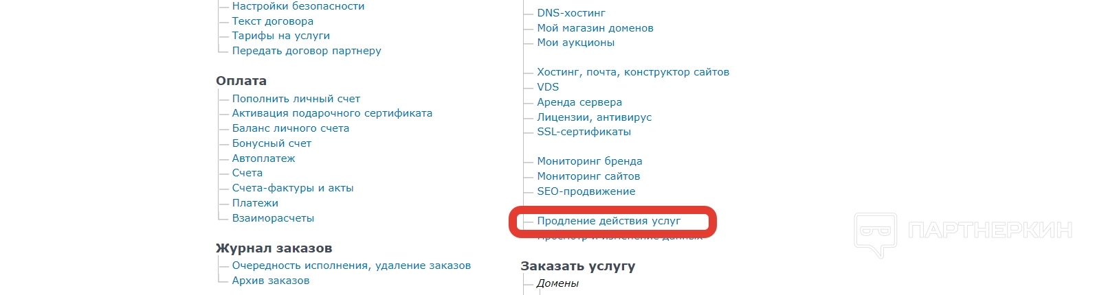 Продление услуги — в этом разделе можно продлевать любую услугу, если срок ее использования подходит к концу. Например, оплатить домен на грядущий год.